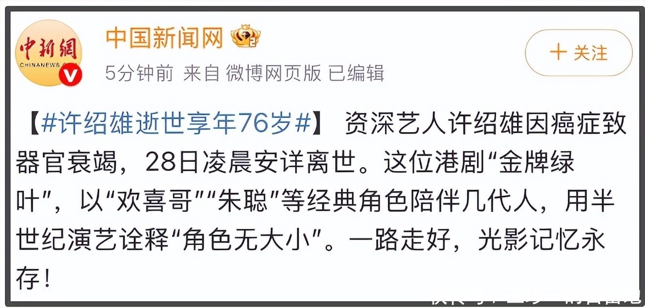 一路走好!76岁演员许绍雄离世,隐瞒患癌消息,中秋聚餐仍乐呵